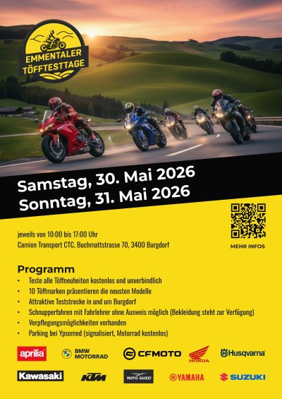 Am 30. und 31. Mai 2026 verwandelt sich Burgdorf in das Mekka für alle, die Motorräder lieben. Die Emmentaler Töfftesttage bieten dir die einmalige Chance, die neusten Modelle zahlreicher Top-Marken kostenlos Probe zu fahren – von Aprilia bis Yamaha und vielen weiteren Highlights der Szene.